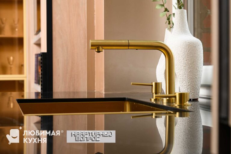 Столешница изготовлена из искусственного камня Grandex. Соединяется он без швов, благодаря чему можно создавать разные формы. Кроме того, над радиатором сделали прорези для выхода теплого воздуха.